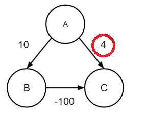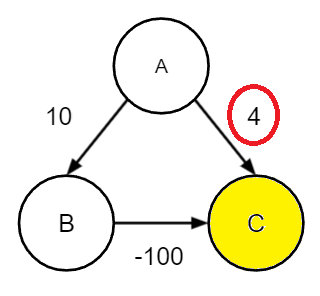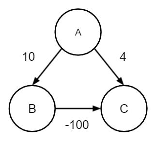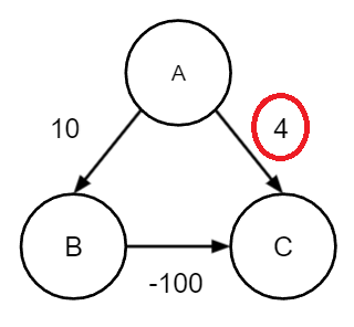 앞서 설명한바와 같이 다익스트라 알고리즘은 탐욕법을 기반으로 하기에 특정 노드로의 최단거리를 "확정" 하여 한번 확정된 노드는 두번다시 방문하지않는 것을 원칙으로 한다. 따라서 아래와 같이 그래프에 음수 간선이 존재할 경우 C를 이미 방문하였기 때문에 A->C에 대한 최단경로는 4가 되어버린다.