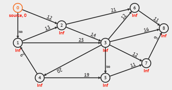 다익스트라 알고리즘의 전개는 다음과 같다: