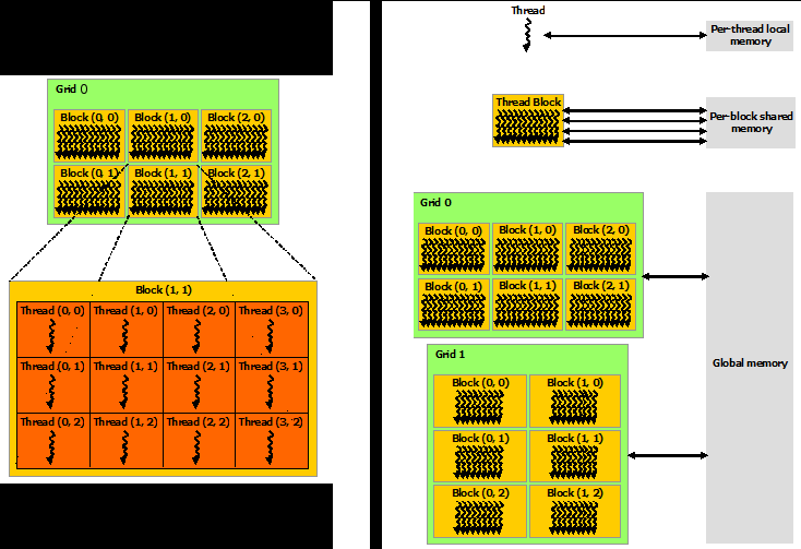 스레드는 동일한 스트리밍 멀티프로세서(SM)를 공유하는 블록으로 그룹화된다. 이러한 이유로, 서로 다른 블록이 가능한 한 서로 독립적이라는 것이 매우 중요하다. 이렇게 하면 외부 공유 메모리에 저장된 컨텐츠에 액세스하기 위한 동기화 관련 패널티뿐만 아니라 더 높은 수준의 캐시에 액세스하기 위한 패널티도 줄어든다. 편의를 위해 각 커널은 1차원(각 스레드는 고유 인덱스, 선형 레이아웃으로 식별됨), 2차원(각 스레드는 2개의 인덱스, 그리드 레이아웃으로 식별됨), 심지어 3차원까지 인덱싱할 수 있는 N개의 스레드를 생성한다. 이것은 프로그래머에게 정말 가치가 있다. 메모리와 스레드 계층 설명은 그림 2에 잘 나타나 있는데, 여기서 독자는 두 커널에 대해 각각의 두 그리드 메모리 레이아웃(그리드 0과 그리드 1)을 볼 수 있다. 또한 왼쪽에는 grid-0 스레드 레이아웃과 인덱싱도 나와 있다.