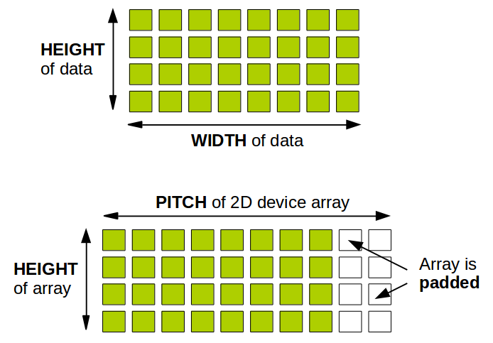 프로그래머의 관점에서 볼 때, 해야 할 일은 2D 메모리 배열을 할당해야 할 때 cudaMallocPitch()를 호출하는 것이다.