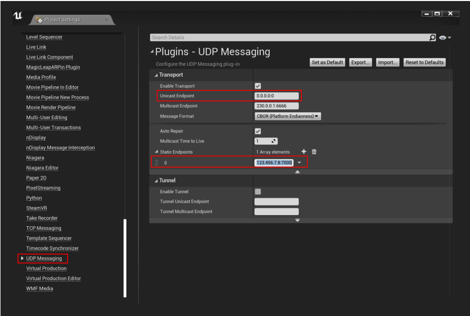 [ 프로젝트 셋팅 > UDP 메시징 ] 에서 스태틱 엔드포인트 배열 추가 후 HOST의 하마치 IPv4 주소를 0.0.0.0:7000 형식으로 기입
