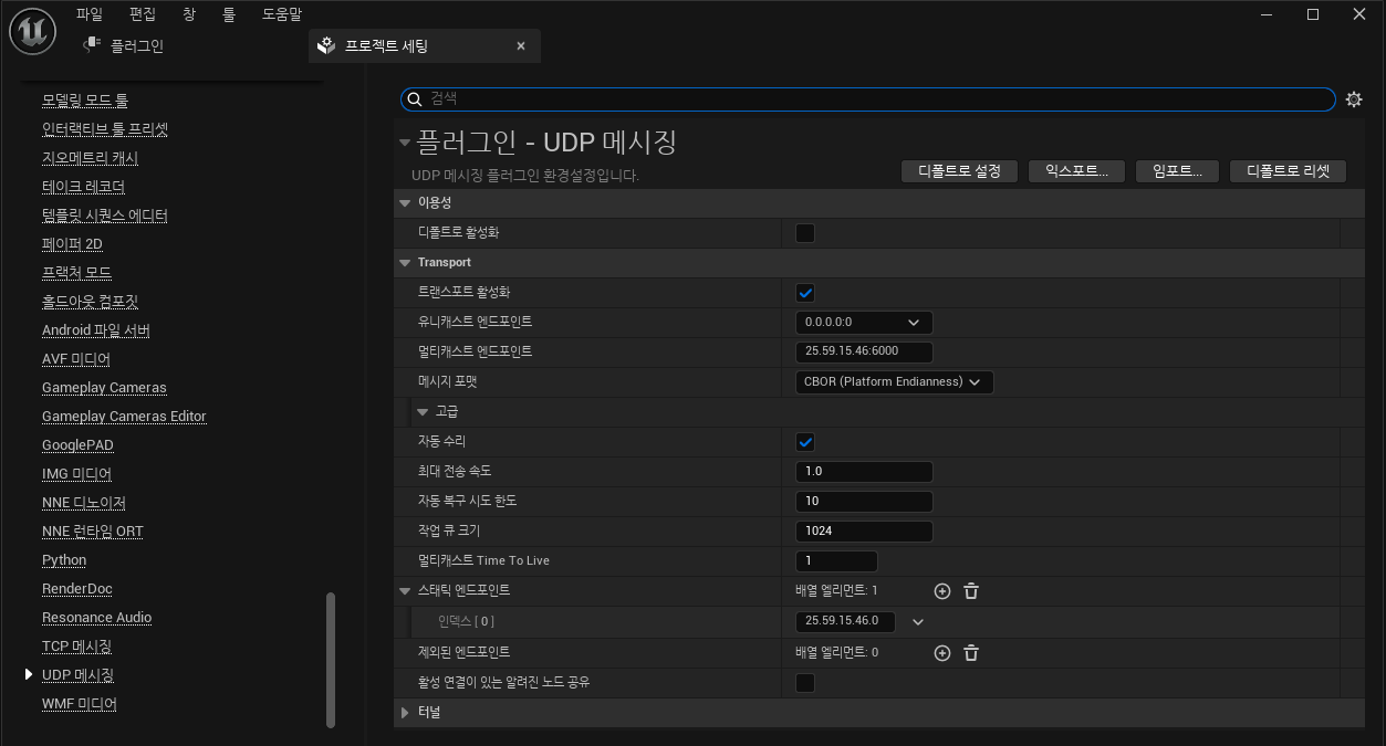 [ 프로젝트 셋팅 -> UDP 메시징 ]에서