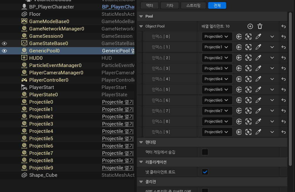 여기까지 구현이 완료되었으면 게임을 실행하면 생성된 GenericPool 액터와 미리 생성된 Projectile 액터들을 볼 수가 있다.