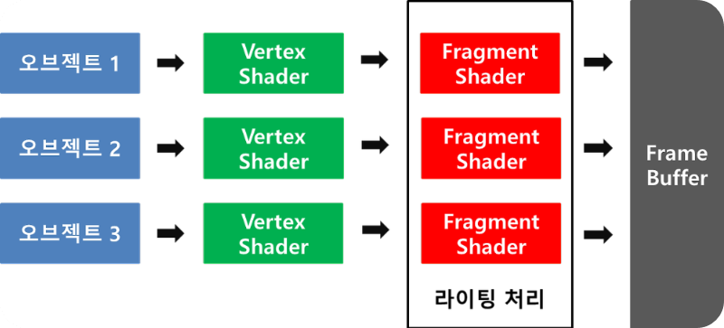 | 방식 | 즉시 라이팅 & 셰이딩 | 나중에 라이팅 수행 |
